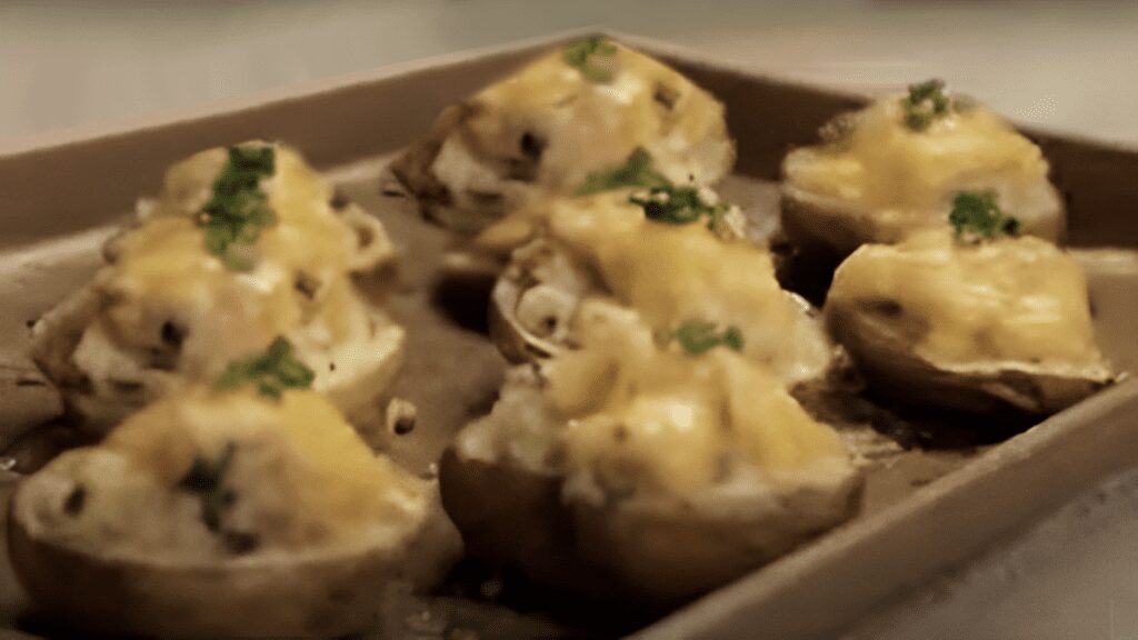 Lleva las papas nuevamente al horno hasta que el queso se derrita y se dore ligeramente.