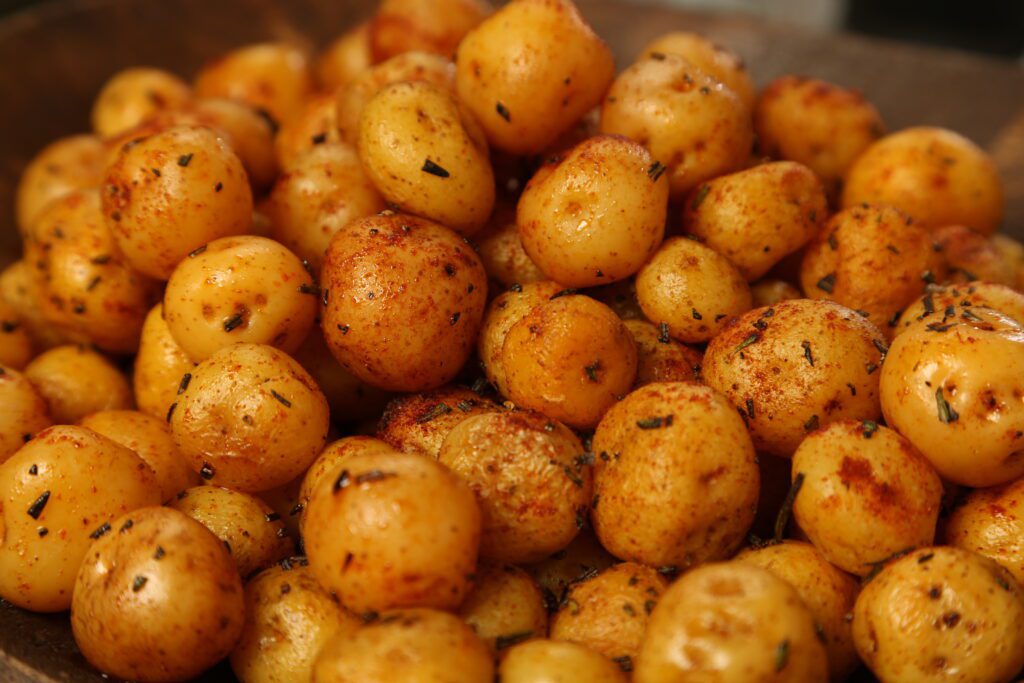 Lavar muy bien las papas criollas, retirar restos de tierra, retoños o raíces, si tuvieran. En una cacerola, poner las papas, agregar agua suficiente que las cubra, media cucharadita de sal y cocinar a fuego medio durante 25 minutos o hasta que estén blandas pero firmes. Retirarlas del agua, dejarlas escurrir y bañarlas con el zumo de limón. Para preparar las especias, calentar una sartén a fuego bajo y tostar el comino, el ajo, la cebolla, la paprika y la pimienta de cayena; molerlas y reservar.