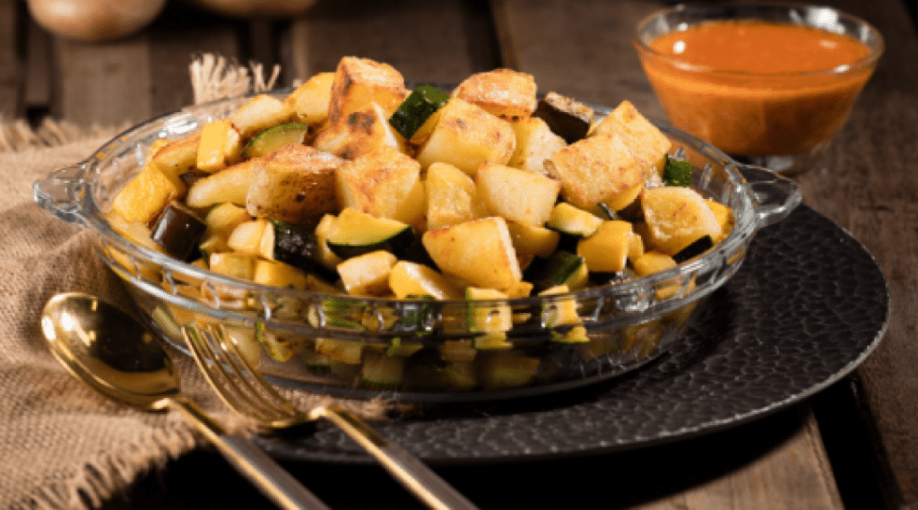 Precalentar el horno a 180 °C. Poner las papas en una bandeja de hornear ligeramente aceitada, espolvorearlas con un poco de sal y llevar al horno por 40 minutos. Para desamargar la berenjena, preparar una salmuera con 300 ml. de agua y 120 gr. de sal y sumergirla durante 30 minutos; escurrirla y disponerla junto a los calabacines previamente cortados en dados en una bandeja con sal y aceite de oliva, hornear a la misma temperatura por 20 minutos. Pelar las papas con cuidado, cortarlas en dados o bastones y mezclarlas con los vegetales.
