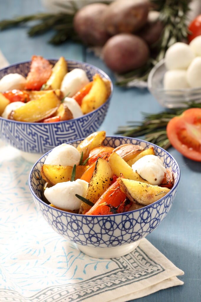 Lavar las papas muy y cortarla en cuatro partes, aliñar con aceite y sal pimienta por 20 minutos, colocar en una bandeja junto al tomate chonto troceado en cuatro, el ajo en láminas y el romero finamente picado, hornear a 200 gramos por 45 minutos o hasta que estén las papas tiernas. Puede decorar con queso Boccherini o cualquier queso maduro.